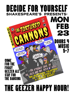 Come for the jazz concert - Stay for the dance party with the dancing and the eating and drinking down in Shakespeare’s Lower Level. Leonard “DUKE” Duke and his Cannons perform selections from hundreds of Jazz, R&B, Rock, Soul, and original music in their repertoire. They do this every other Monday for the enjoyment of a mighty lively group of regulars spending their Social Security checks. Crowded dance floor. Friendly staff. Free Parking. Complimentary popcorn.(!) Often a local musical guest is allowed on stage – who knows who it will be this time? Doors 4pm, Music from 5 until 7.
